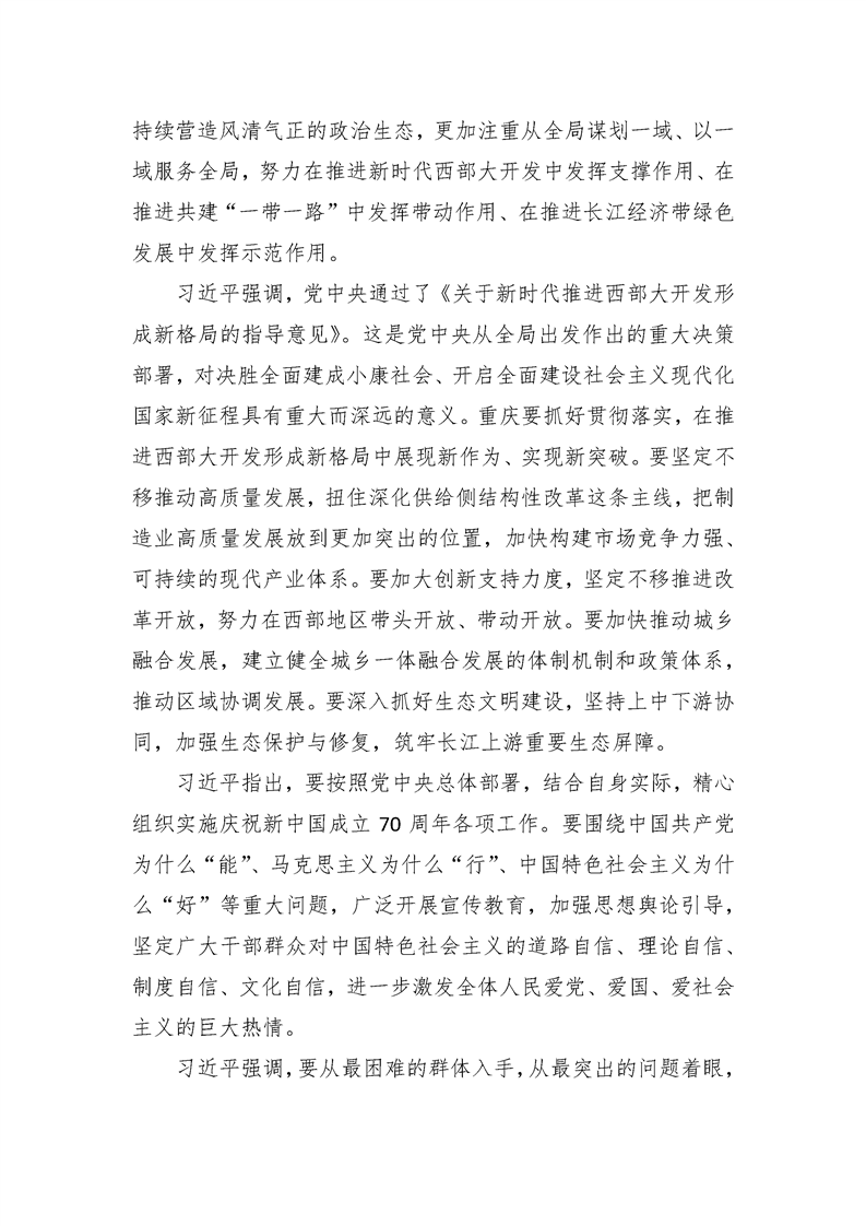 统一思想一鼓作气顽强作战越战越勇 着力解决“两不愁三保障”突出问题——习近平在重庆考察并主持召开解决“两不愁三保障”突出问题座谈会上的讲话精神