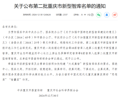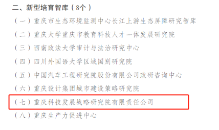 近期,市委宣传部与市社会科学界联合会共同发布了“第二批重庆市新型智库名单”,凯发k8国际下属重庆科技开展战略研究院公司成功入选新型培育智库。